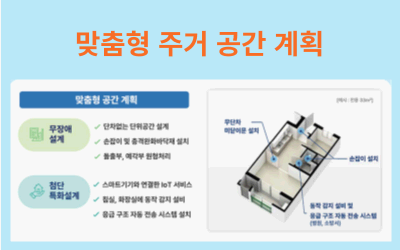 - 고령자 맞춤형 주거공간 구현: 화장실 변기와 욕조 옆에는 손잡이를, 샤워실‧현관에는 간이의자를 설치하고 모든 주거 공간에 단차와 턱을 없애는 등 무장애 및 안전설계를 적용,욕실, 침실 등에는 응급 구조 요청시스템도 설치한다.