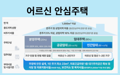 - 65세 이상 무주택 어르신 1인 또는 부부가구를 위주로 민간과 공공으로 유형을 나누어 공급